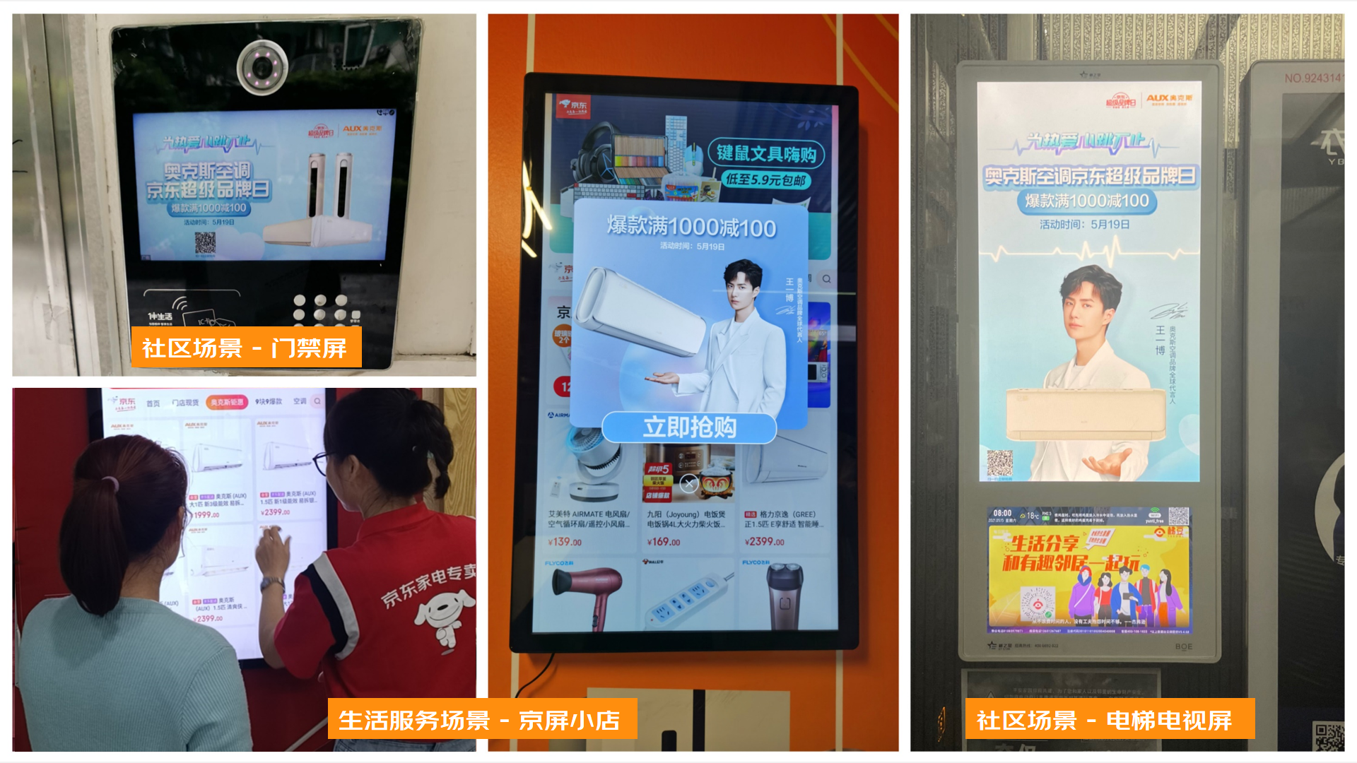 营销场景选定后,京屏果丰富的线下场景资源储备优势尽显无疑,通过整合包含社区、生活服务等场景的电梯海报、电梯电视屏、门禁屏、京屏小店等众多优质媒体资源,京屏果帮助奥克斯全方位覆盖目标群体的活动范围,使奥克斯品牌信息高频、高效、高精准度地触达影响目标用户,强化影响消费者心智,进一步带动奥克斯产品转化率,并提升奥克斯在用户心中的品牌价值与口碑。