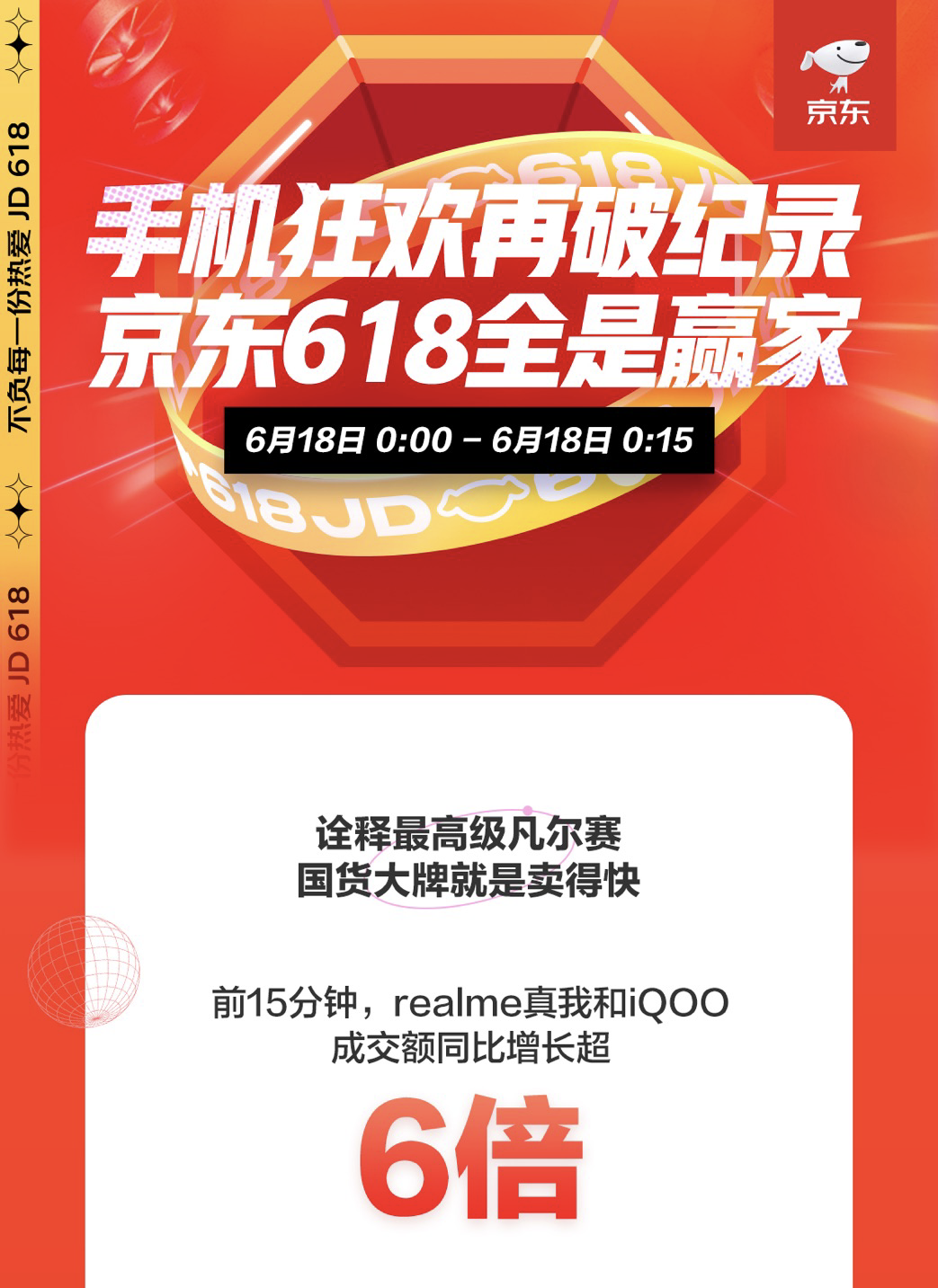 如今的国产手机大牌不仅拥有崭新的产品设计和极具中国文化内涵的品牌理念,更有匠心独运的超高品质,在京东618进入白热化阶段中纷纷实现新突破!数据显示:仅15分钟,realme真我和iQOO成交额同比增长超6倍;与此同时,国际大牌也捷报频传!iPhone成交额1秒破亿、三星手机也取得销量同比增长200%的亮眼成绩。